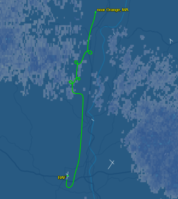 According to preliminary findings from Automatic Dependent Surveillance–Broadcast (ADS-B) radar data, the aircraft took off from runway 20 at Westfield-Barnes Regional Airport (BAF) in Westfield/Springfield, Massachusetts, around 1106 EST. Subsequently, it executed a 180-degree left turn toward the north-northeast, climbing to an altitude ranging from 3,000 to 3,300 feet mean sea level (MSL). Over the course of its flight, the aircraft performed four alternating 360-degree turns while maintaining a northbound trajectory. After the fourth turn, the aircraft initiated a climb, reaching approximately 4,000 feet msl, followed by a rapid descent that concluded at 1125.